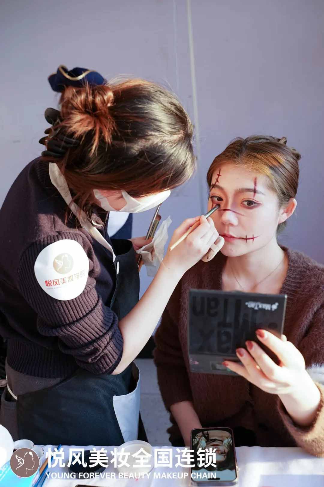 "商业实践日"是悦风具特色的教学活动。学院与本地婚庆公司、摄影机构、网红经纪公司合作,为学员提供真实的商业接单机会。学员通过学院的推荐,完成了人生第一单商业化妆,收入800元。"当客户转账的那一刻,突然意识到,自己的爱好真的可以赚钱。"。